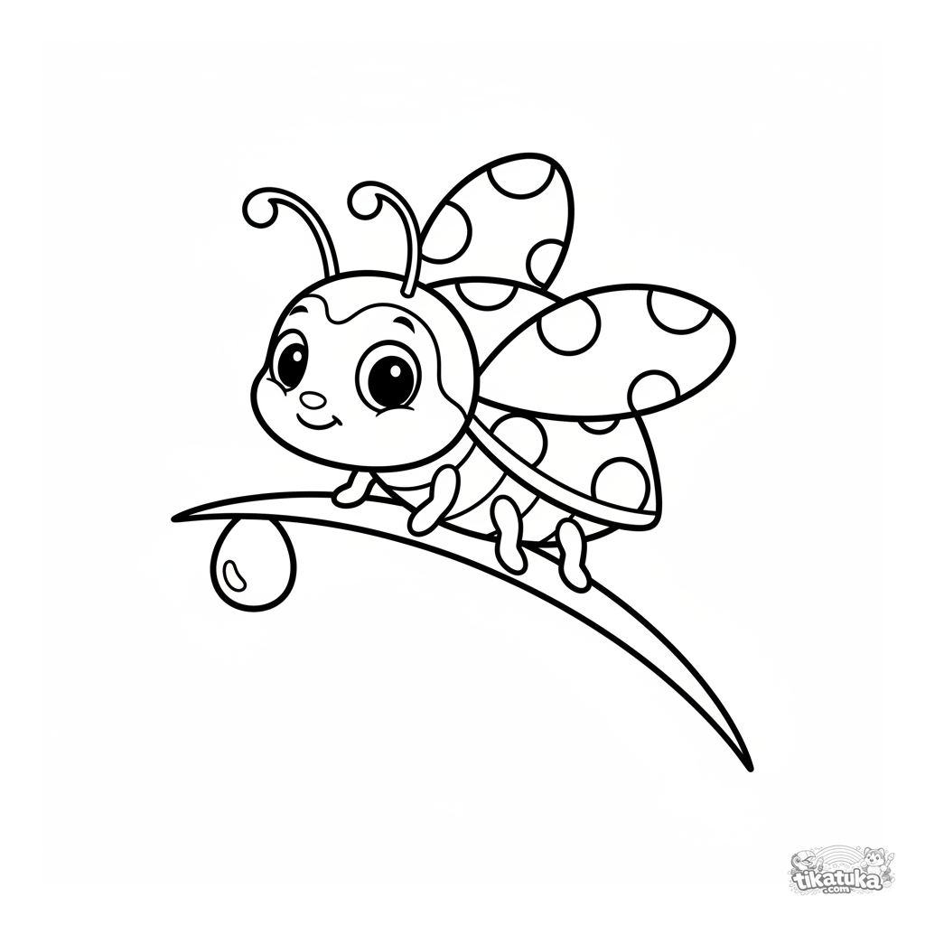 Einfaches Marienkäfer-Ausmalbild für Kleinkinder von 2-3 Jahren. Große, klare Formen, ein Marienkäfer balanciert auf einem Grashalm auf einer Wiese.