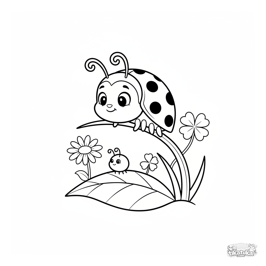 Ausmalbild eines Marienkäfers, der auf der Spitze eines Grashalms balanciert. Für Kinder von 4-6 Jahren. Das Insekt schaut auf eine Blattlaus hinab, mit Blumen im Hintergrund.