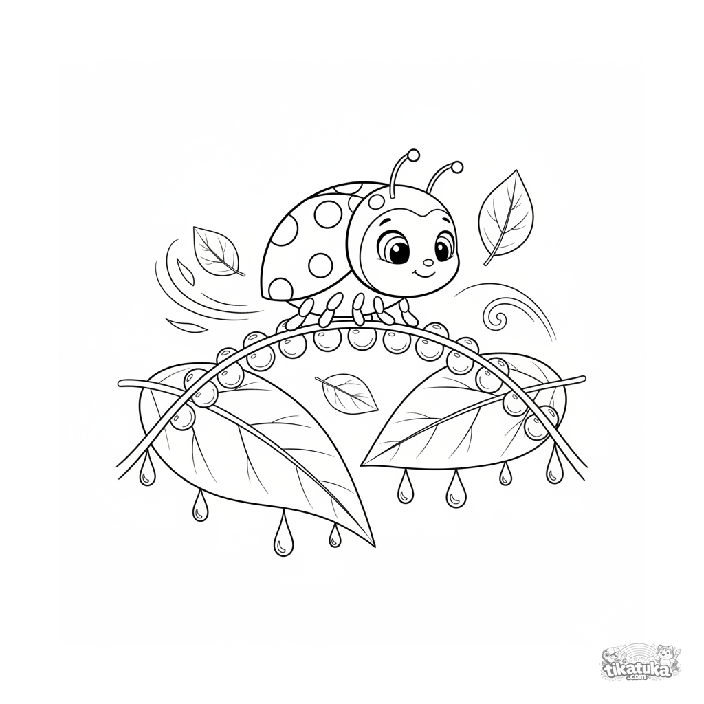 Ausmalbild für Kinder 4-6: Ein Marienkäfer läuft über eine fragile Brücke aus Tautropfen auf einem großen Blatt. Niedliche Szene mit Details.