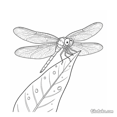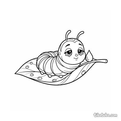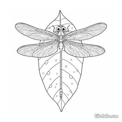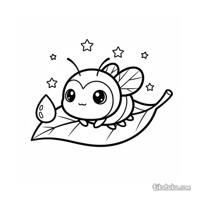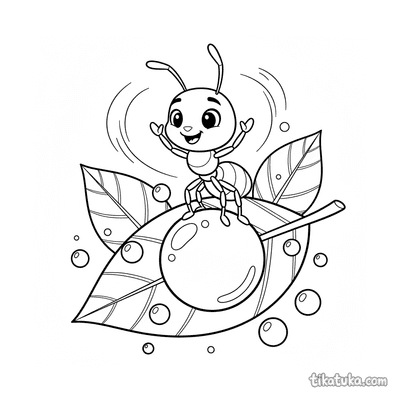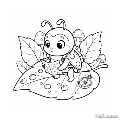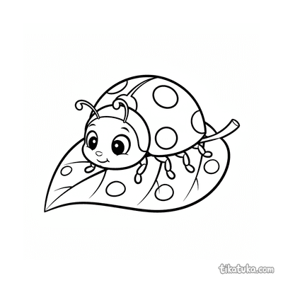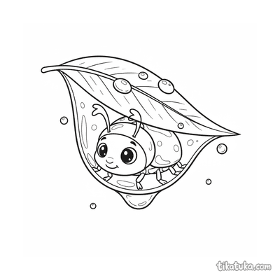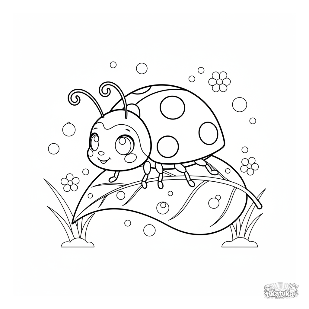 Ausmalbild für Kinder 4-6: Ein Marienkäfer balanciert auf einem großen grünen Blatt mit funkelnden Tautropfen. Niedliche, einfache Szene.