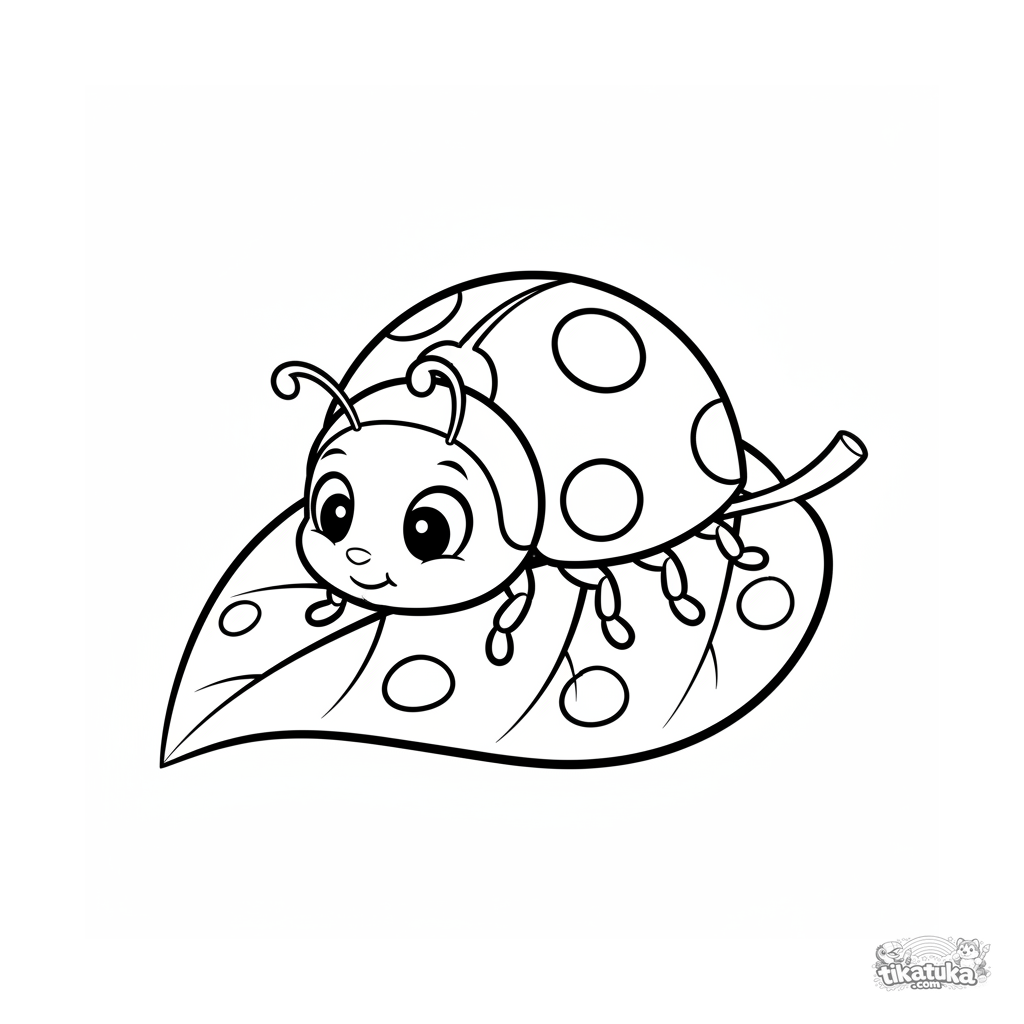 Ausmalbild für Kleinkinder: ein freundlicher Marienkäfer krabbelt auf einem großen grünen Blatt mit Tautropfen.