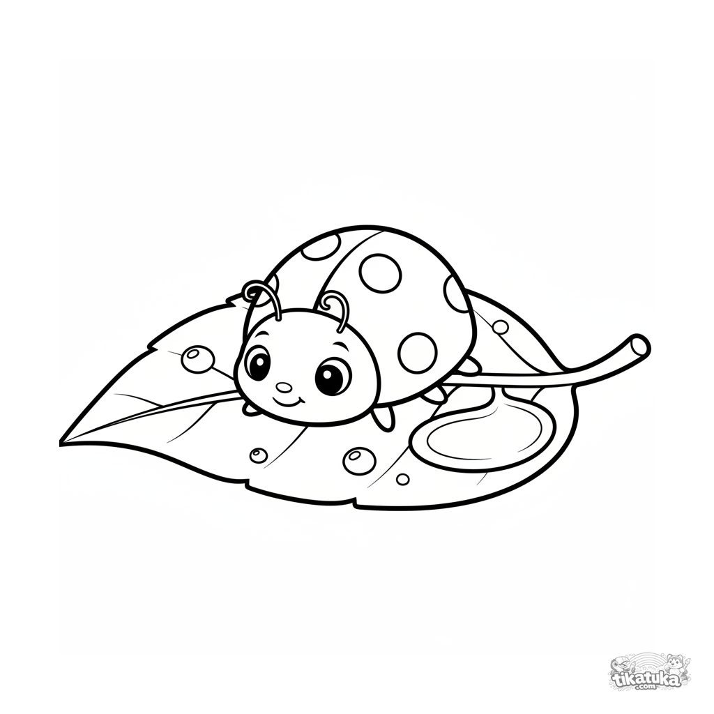 Malseite für Kleinkinder: Ein Marienkäfer krabbelt auf einem großen grünen Blatt mit Tautropfen. Einfache Formen, breite Ränder, perfekt für Kinder von 2-3 Jahren.