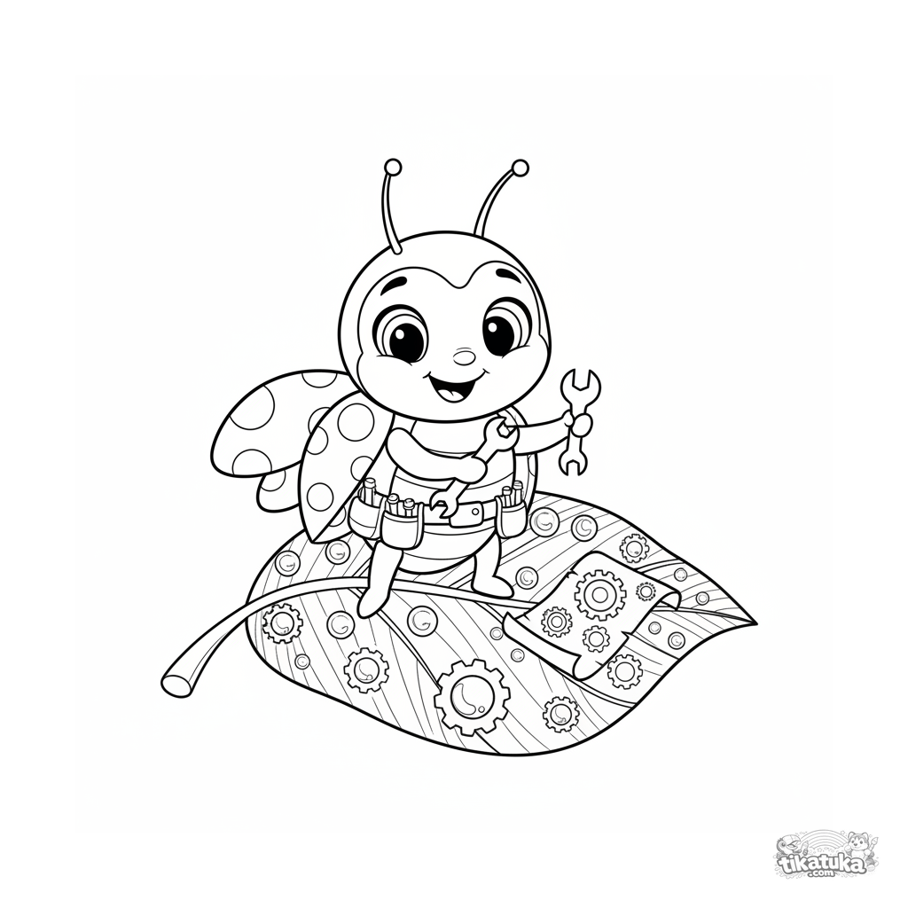 Ausmalbild für 10-12 Jahre: Ein Marienkäfer-Ingenieur repariert einen Tautropfen-Mechanismus auf einem großen grünen Blatt.