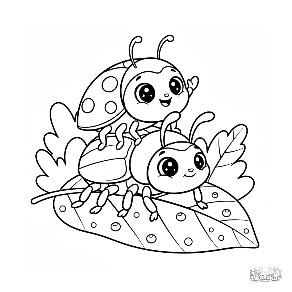 Lustiges Ausmalbild für Kinder 4-6: ein Marienkäfer reitet auf dem Rücken eines großen Käfers über ein taufeuchtes Blatt.
