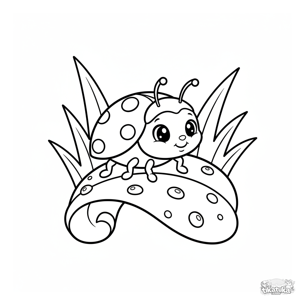 Einfaches Ausmalbild für Kleinkinder von 2-3 Jahren mit einem Marienkäfer auf einem Blatt. Große Formen, klare Umrisse.