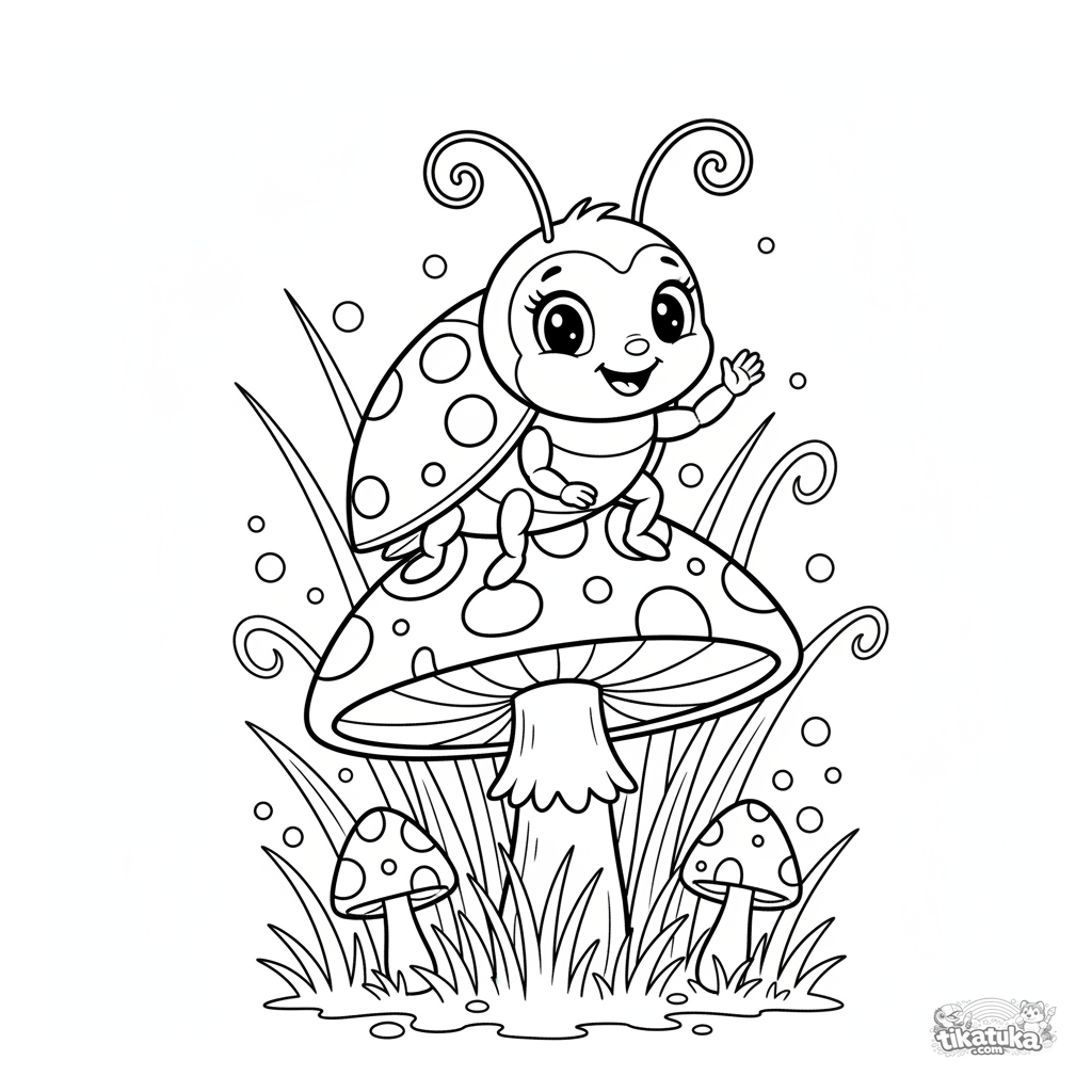 Ausmalbild eines freundlichen Marienkäfers mit gemusterten Flügeln auf einem Pilz. Für Kinder von 4-6. Das Insekt winkt zwischen Grashalmen und Tautropfen.