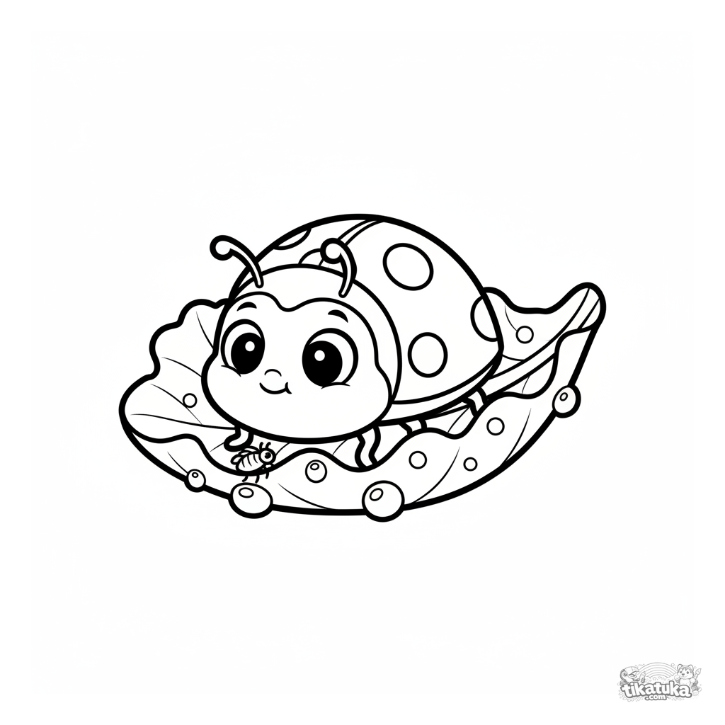 Kleinkind-Ausmalbild 2-3: Ein dicker Marienkäfer auf einem lockigen Salatblatt im Garten, der eine winzige Blattlaus betrachtet. Einfache Formen, große Details.