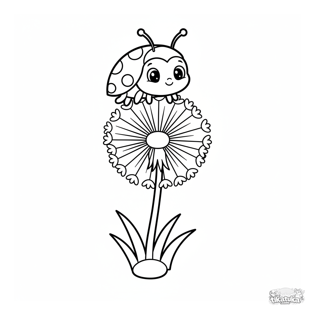 Einfaches Kleinkind-Ausmalbild eines Marienkäfers. Großes Insekt mit gepunkteten Flügeln sitzt auf einer Pusteblume, minimale Details für 2-3 Jahre.