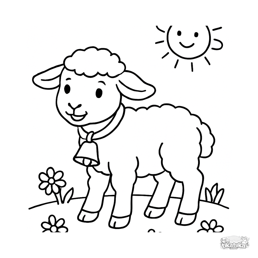 Ausmalbild für Kinder. Ein flauschiges weißes Lamm auf einer sonnigen grünen Wiese mit Gänseblümchen, mit einer Glocke an rotem Band. Kostenlos herunterladen.