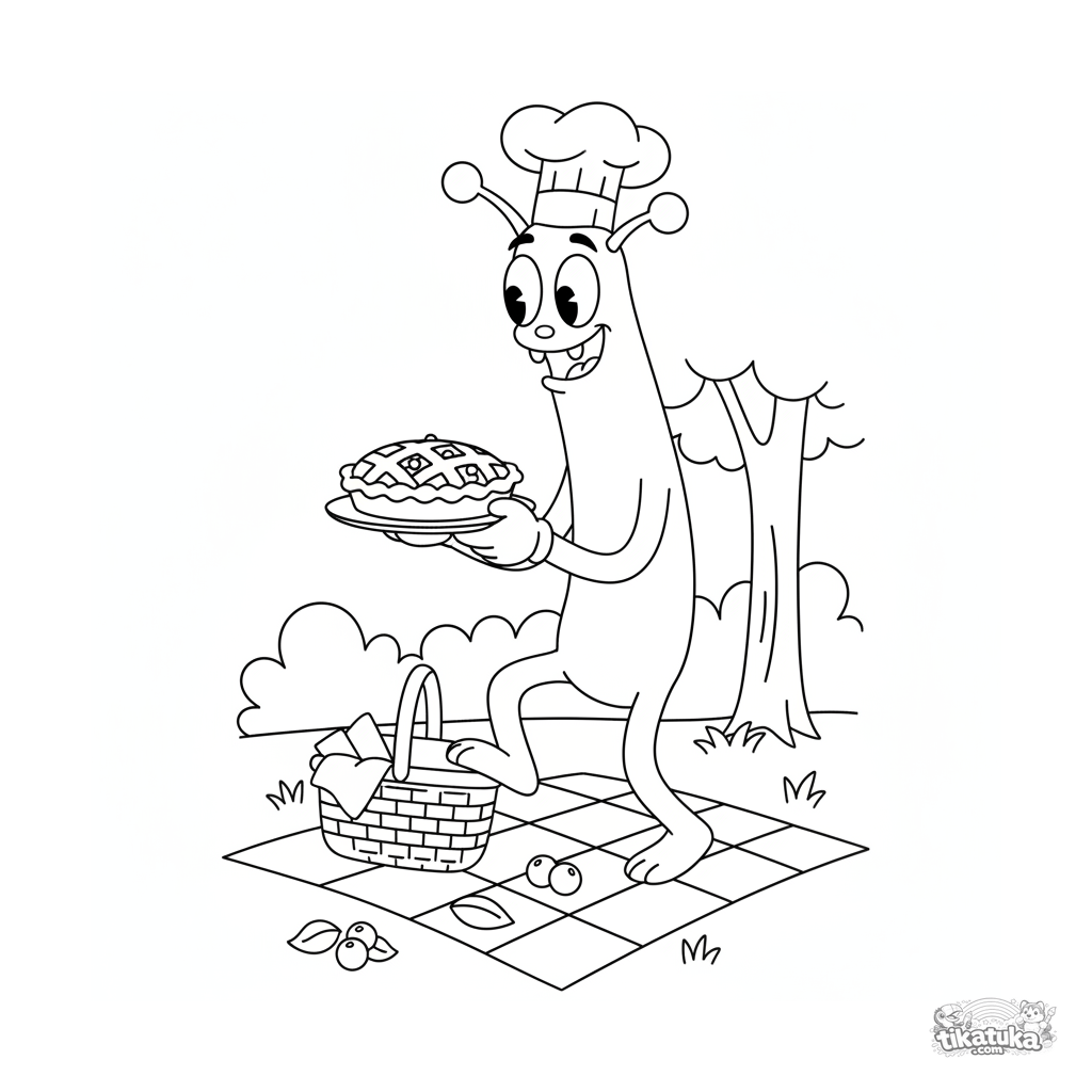Ausmalbild für Kinder 7-9: Ein schlaksiges Monster im Retro-Rubber-Hose-Stil trägt einen Kuchen über eine Picknickdecke.