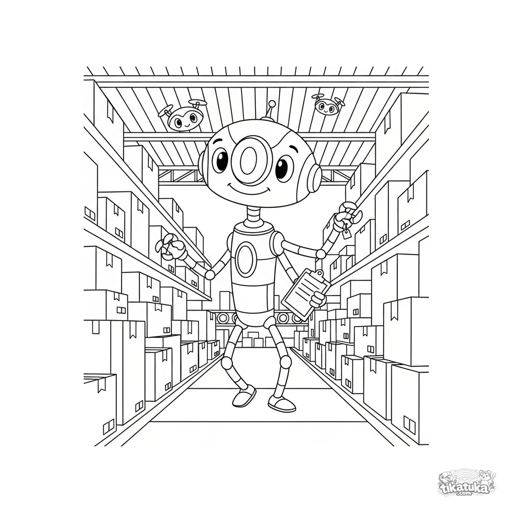 Ausmalbild für Kinder 7-9: Ein großer Retro-Roboter macht Inventur im Lager. Lustige Gummi-Gliedmaßen und alter Cartoon-Stil.