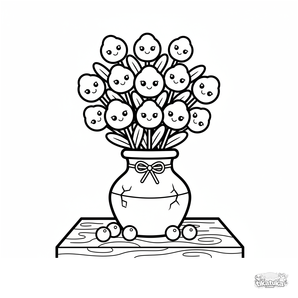 Sehr einfaches Ausmalbild für Kleinkinder 2-3: Ein Lavendelstrauß in einer Vase auf einem Tisch. Große blockige Formen, minimale Details.