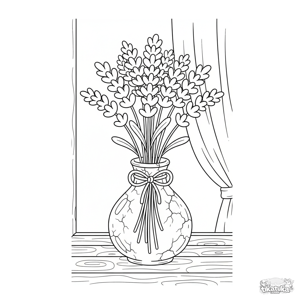Ausmalbild für Tweens 7-9: ein Lavendelstrauß in einer Keramikvase auf einer sonnigen Fensterbank. Mäßige Details, gemütliche Szene.