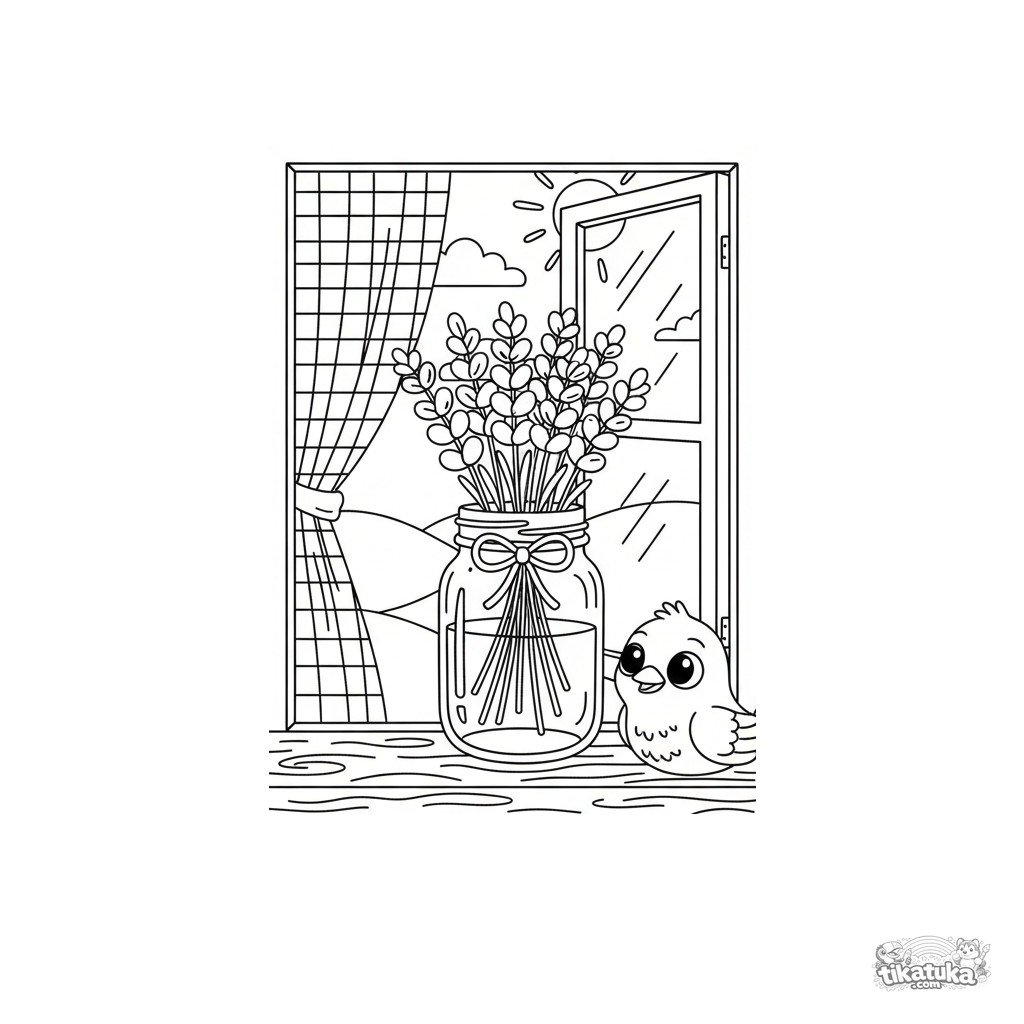 Ein Ausmalbild für Kinder von 7-9 Jahren: ein Lavendelstrauß im Einmachglas auf einer Holzfensterbank. Mit Schnur gebunden, ein Vorhang ist sichtbar, eine gemütliche Szene mit mäßigem Detail.
