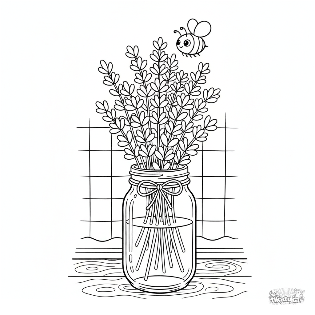 Ausmalbild für 7-9 Jahre: Ein Lavendelstrauß im Einmachglas auf einer Holzfensterbank, mit einer nahe schwebenden Biene.