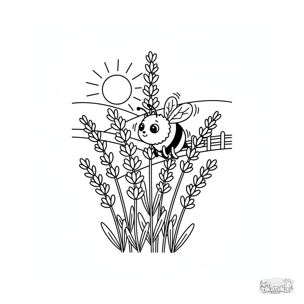 Ausmalbild für Kinder 4-6: Eine Biene sammelt Nektar von blühendem Lavendel auf einem Feld. Helle Szene im Folk-Stil.