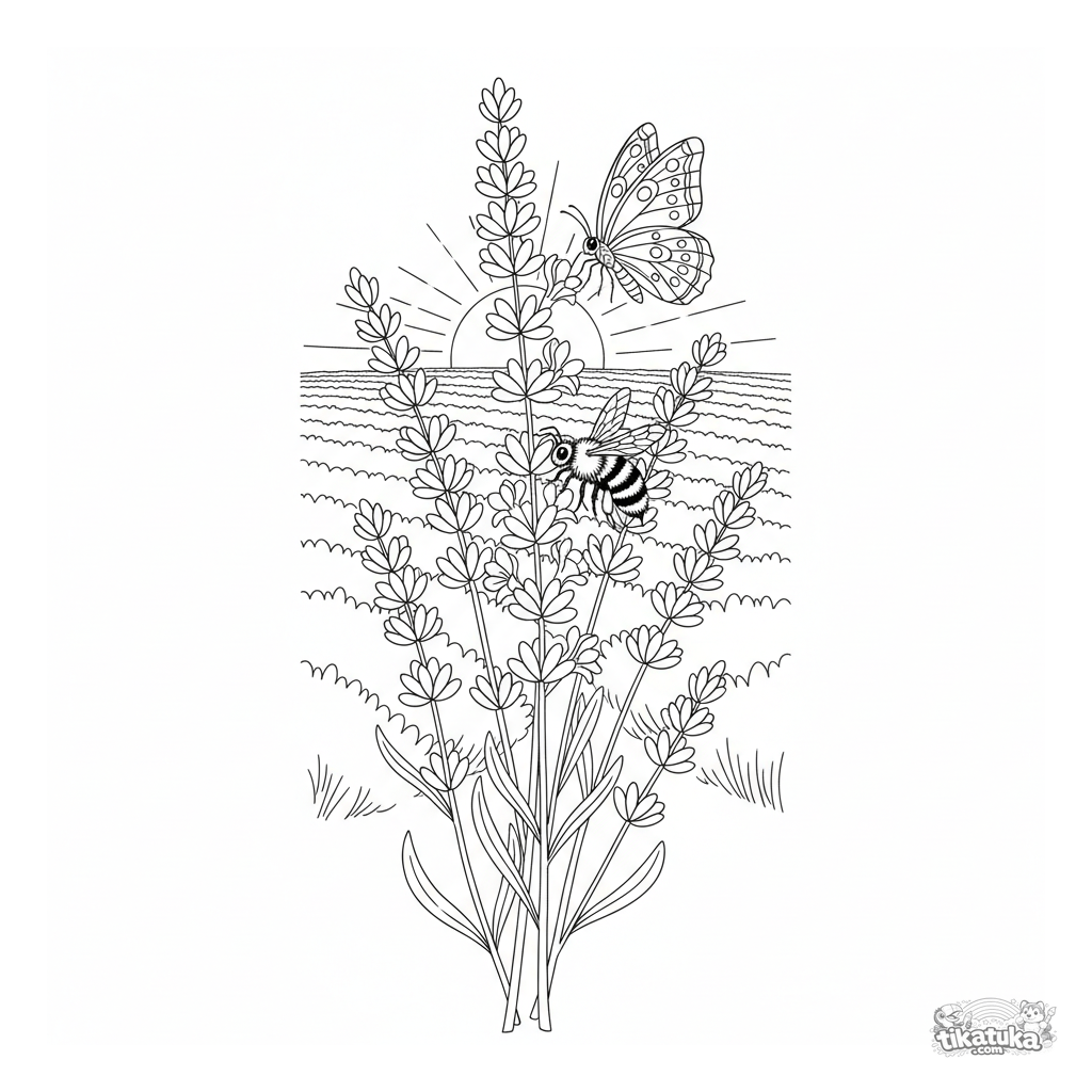 Detailliertes Ausmalbild für Kinder 10-12: Blühender Lavendel mit Biene und Schmetterling vor Feldhintergrund. Naturalistischer Stil.