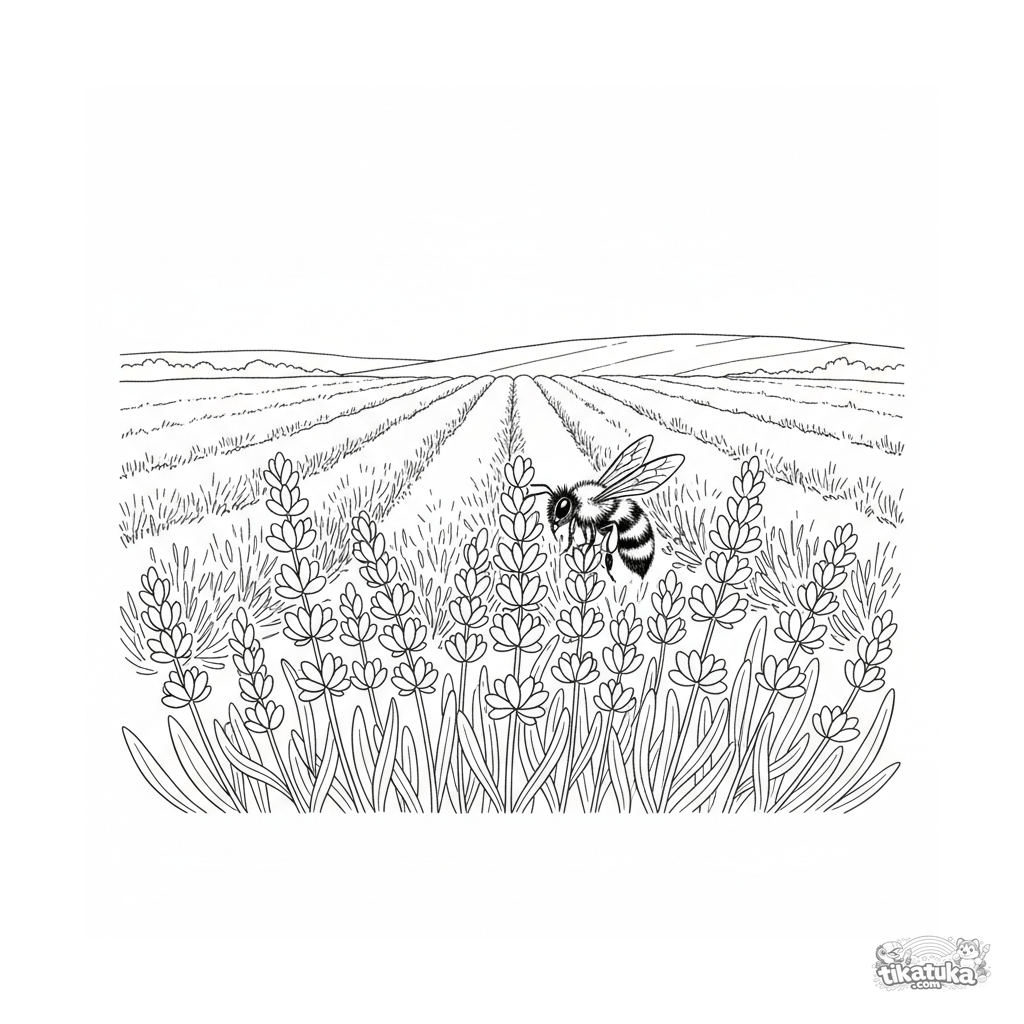 Ausmalbild für ältere Kinder: Eine detaillierte Landschaft eines Lavendelfeldes mit einer Biene und einem fernen Hügel. Hohes Detail, Aquarell-Skizzen-Stil.