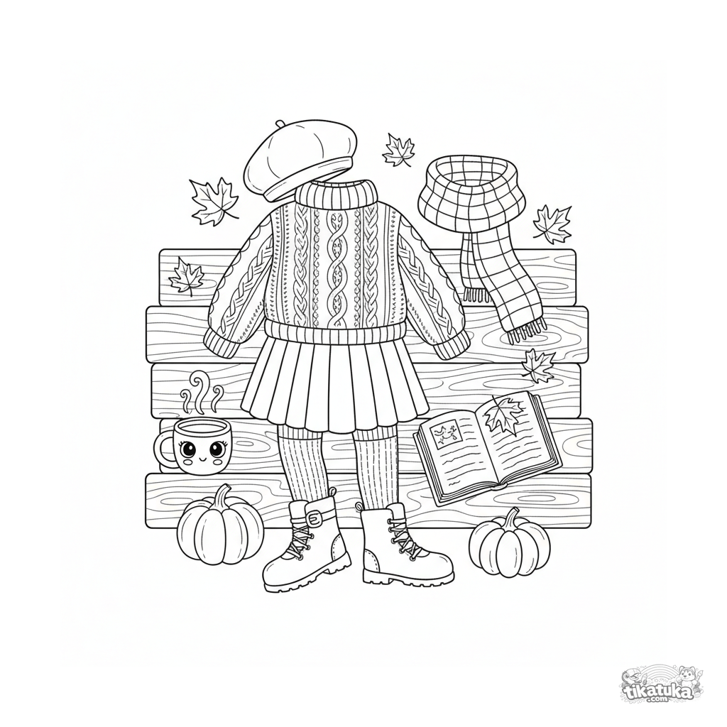 Detailliertes Ausmalbild für 10-12 Jahre: Ein gemütliches Herbstoutfit liegt flach auf einer Veranda mit Kürbissen. Texturen wie Strick, Cord und Karomuster.