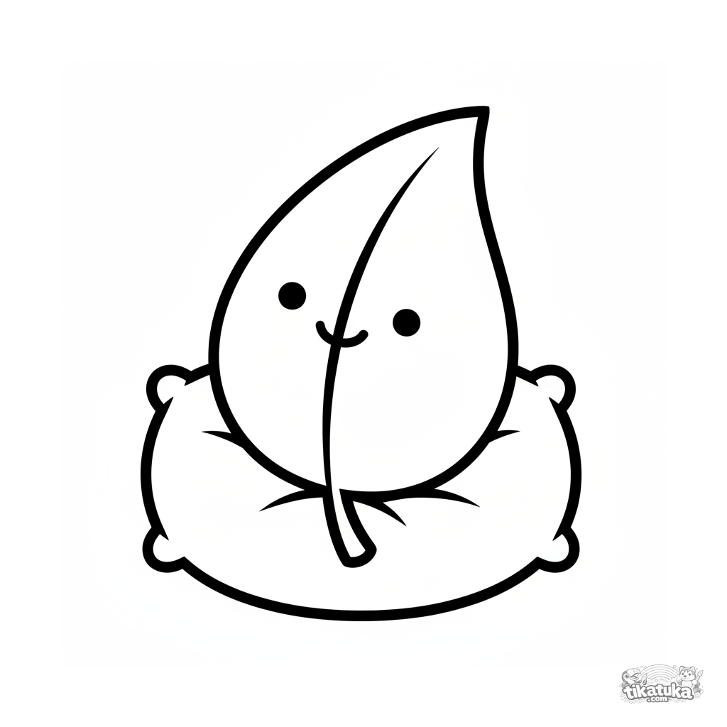 Blatt-Ausmalbild für Kleinkinder 2-3 Jahre: ein lächelndes Blatt auf einem weichen Kissen. Minimale Linien, große Form, fördert die Motorik.
