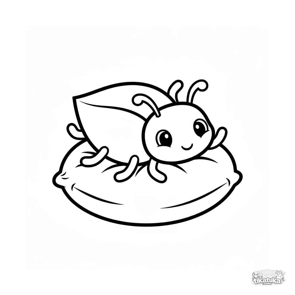 Einfaches Ausmalbild für Kleinkinder 2-3: ein blattförmiger Käfer liegt glücklich auf dem Rücken auf einem Kissen. Flache Formen.