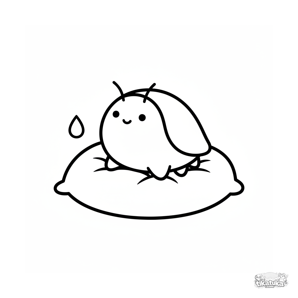 Ausmalbild für Kleinkinder 2-3 Jahre: ein Käfer in Blattform mit Tautropfen sitzt auf einem Kissen. Natürliche weiche Formen.