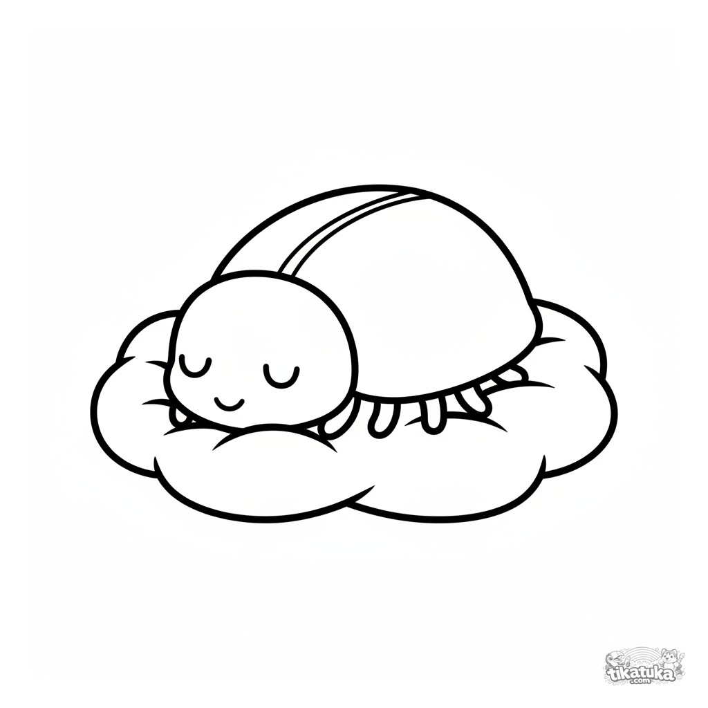 Ausmalbild für Kleinkinder 2-3 Jahre: ein blattförmiger Käfer schläft friedlich auf einem weichen Kissen. Klarer Umriss, wenige Details, große Flächen zum Ausmalen.