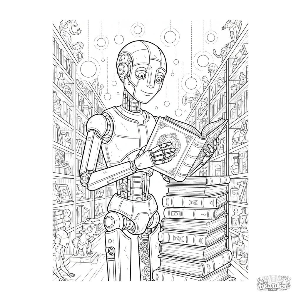 Ausmalbild für ältere Kinder 10-12: Ein detaillierter Bibliotheks-Automat sortiert Bücher in einer magischen Bibliothek. Vintage-Gravurstil mit vielen Elementen.