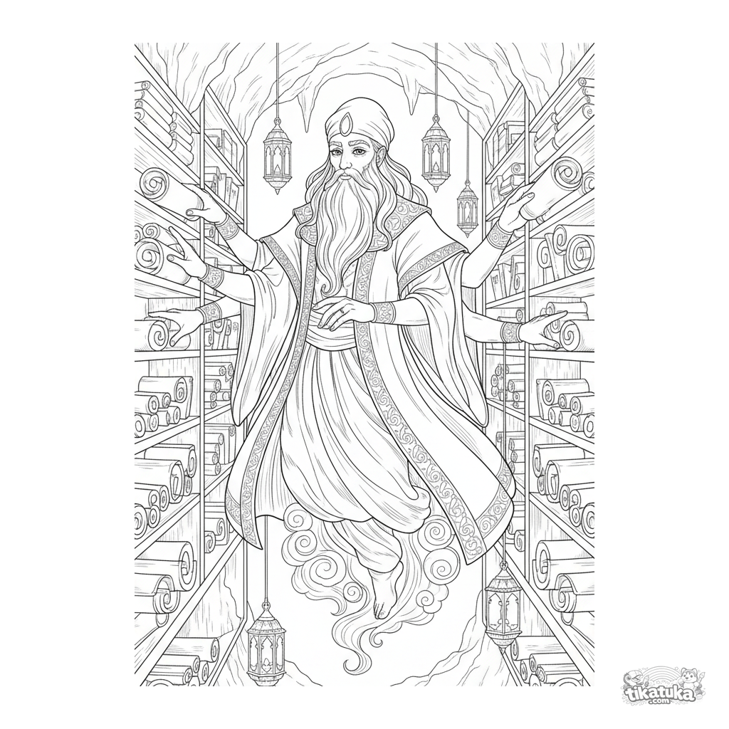 Detailliertes Ausmalbild im Stil alter Stiche für ältere Kinder 10-12: Ein Dschinn-Bibliothekar sortiert Schriftrollen in einem unterirdischen Gewölbe.