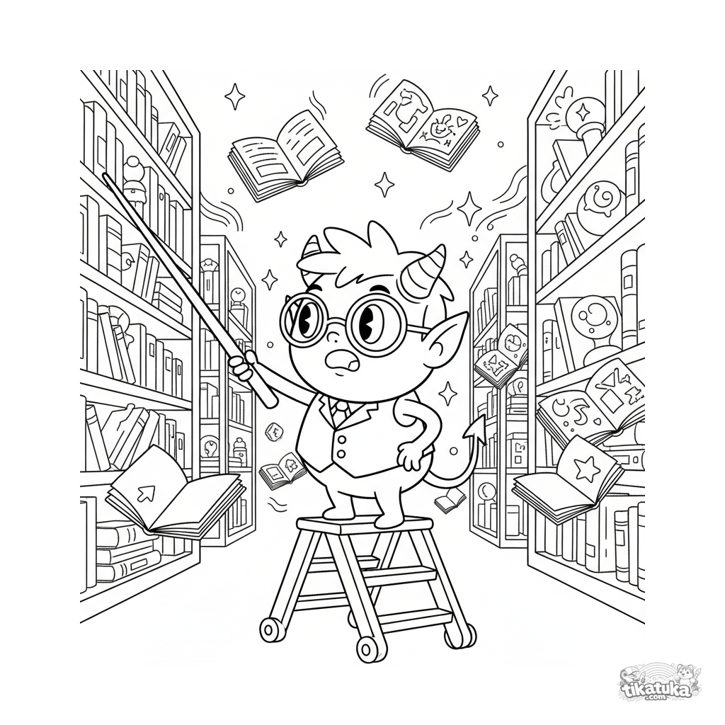 Ausmalbild für 7-9 Jahre: ein Bibliothekskobold mit Brille versucht, in einer magischen Bibliothek Ordnung unter fliegenden Büchern zu schaffen. Lustige und dynamische Szene.