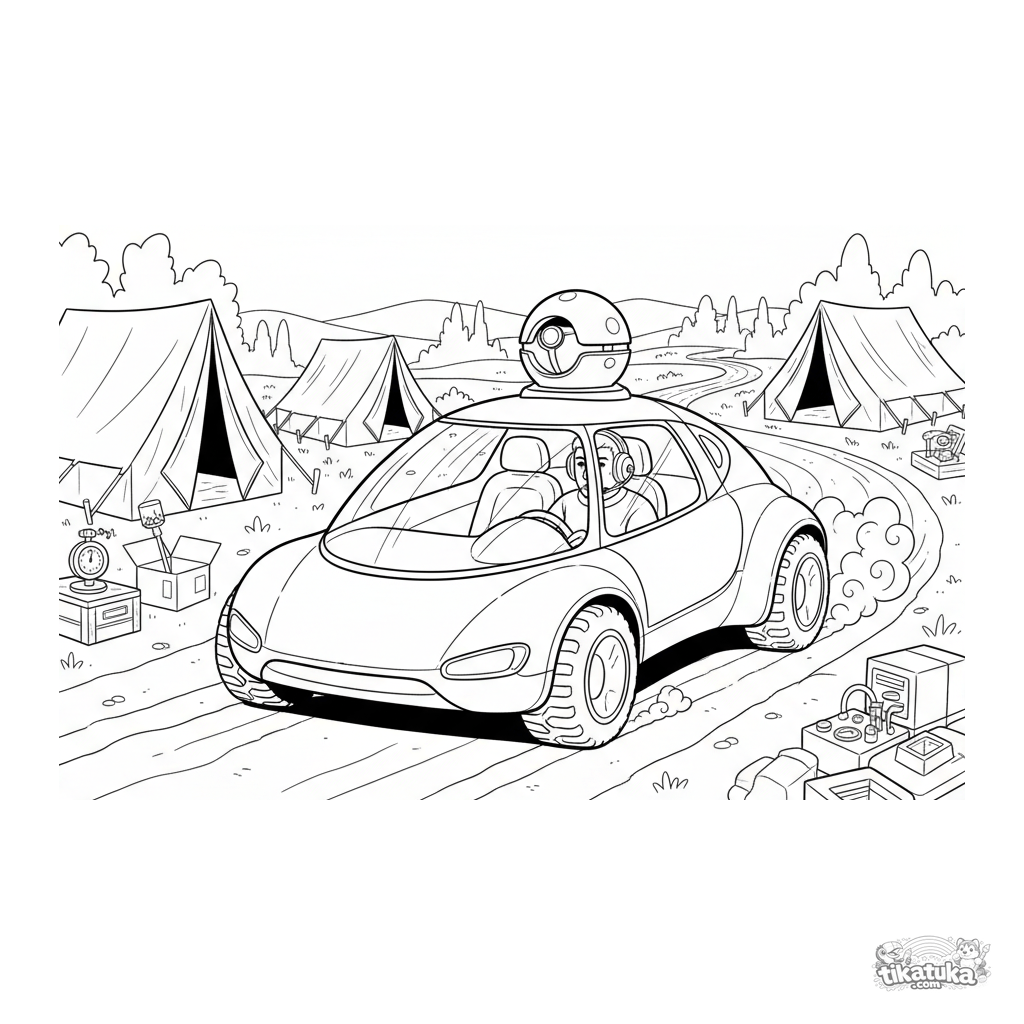 Ausmalbild für ältere Kinder 10-12: Ein detailliertes leichtes Aufklärungsfahrzeug auf Patrouille zwischen Feldzelten. Fahrer mit Headset sichtbar.