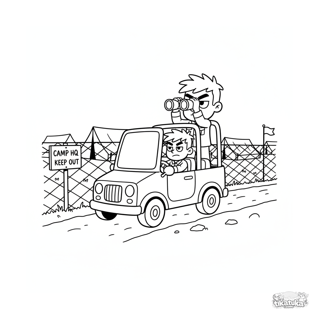 Ausmalbild für 7-9 Jahre: Ein leichtes Militärfahrzeug patrouilliert am Perimeter eines Feldhauptquartierlagers. Ein Soldat darin scannt mit einem Fernglas.