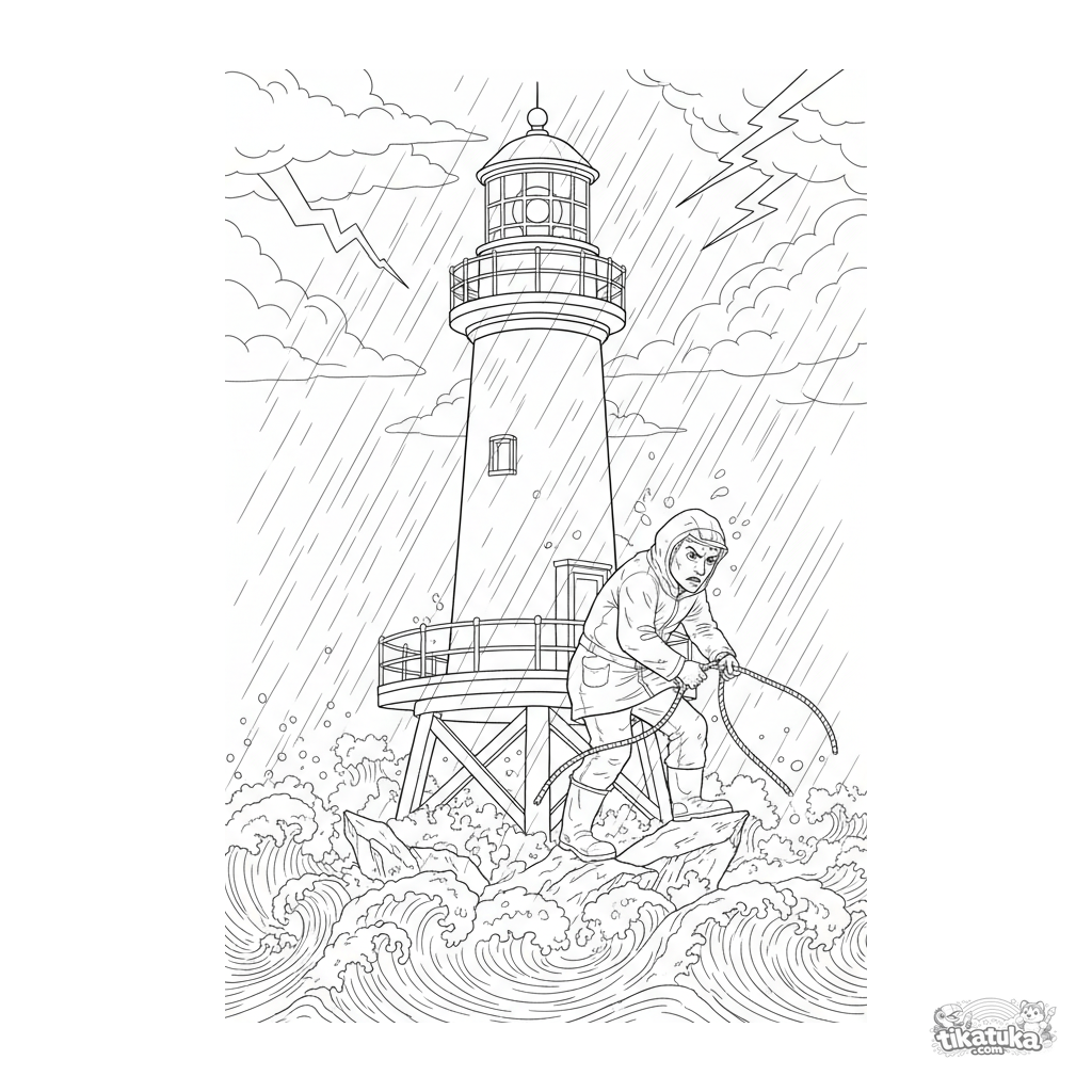 Ausmalbild für 10-12 Jahre: Eine dramatische Szene einer Leuchtturmplattform im stürmischen Meer. Detailliertes Bild des Wärters, der Wellen und des Turms zum kreativen Ausmalen.