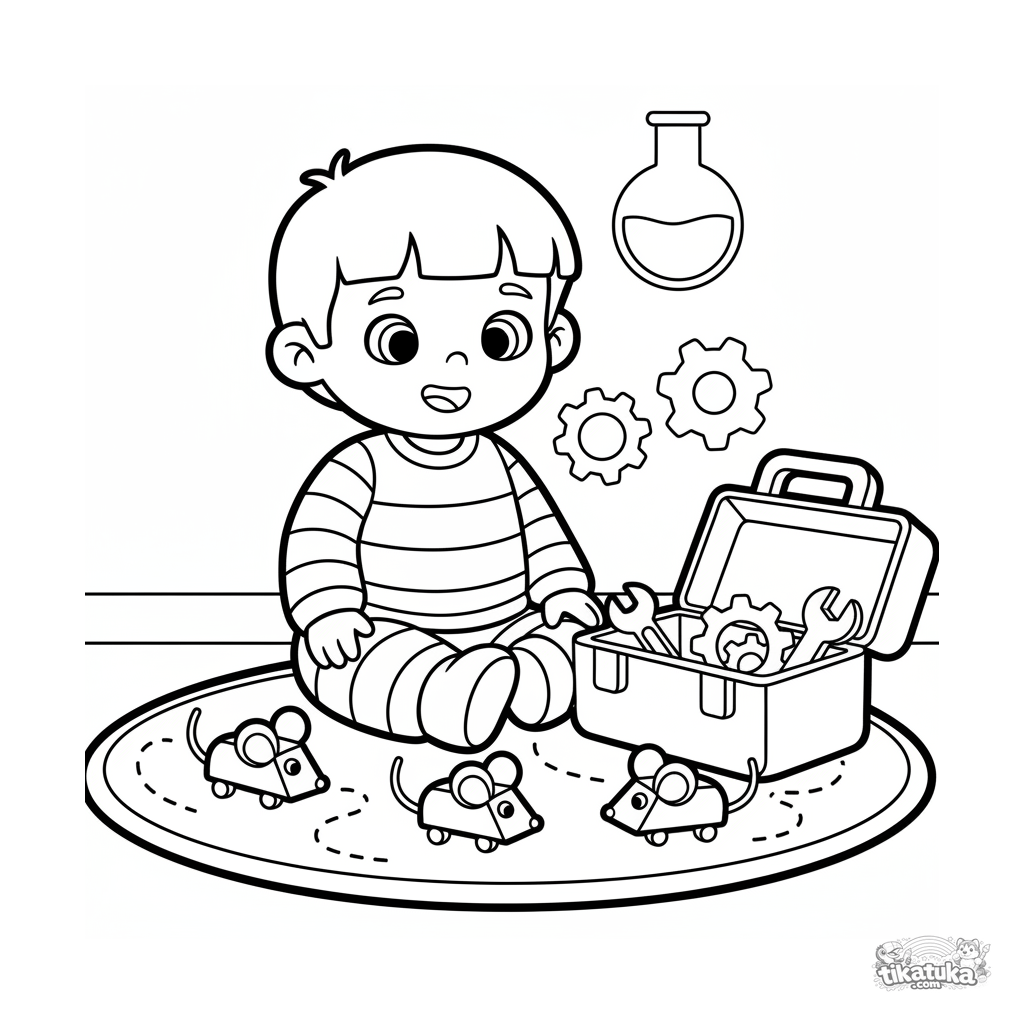 Sehr einfaches Ausmalbild für Kleinkinder 2-3: Ein Junge im Schlafanzug spielt mit Aufziehmäusen im Labor. Große klare Formen, fast kein Hintergrund.