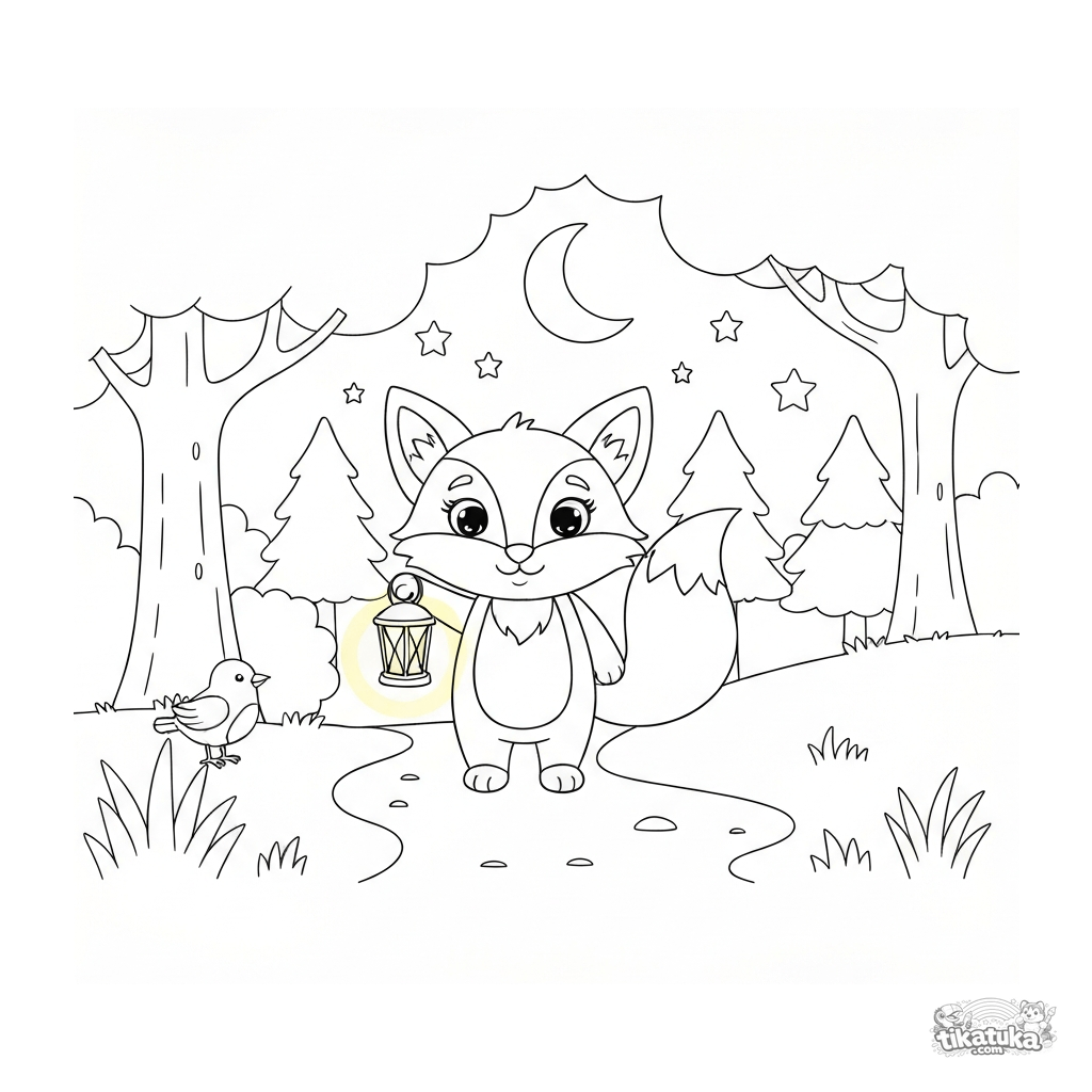 Ein süßes Füchslein läuft mit einer Laterne durch den Wald. Male sein rotes Fell, die helle Laterne und die Sterne am Nachthimmel aus!