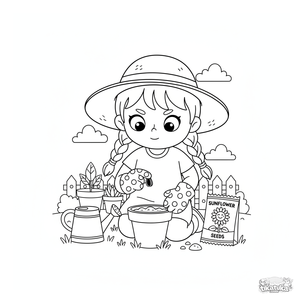 Ausmalbild für Mädchen von 4 bis 6 Jahren. Eine kleine Gärtnerin mit Hut und Handschuhen pflanzt einen Sonnenblumenkern in einen Topf. Niedliche und lehrreiche Szene.