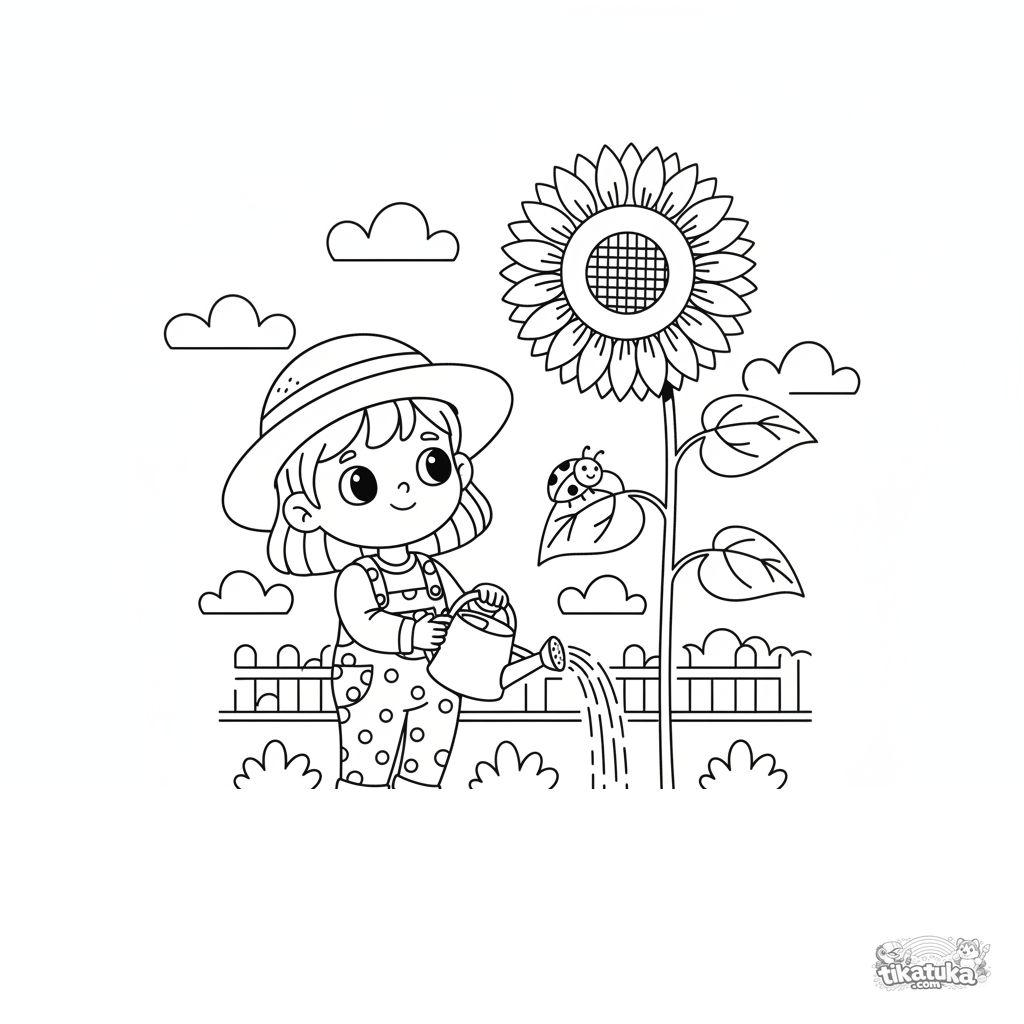 Ausmalbild für Kinder: Ein süßes Mädchen mit Hut gießt eine riesige Sonnenblume mit einer Gießkanne. Gartenszene mit einem Marienkäfer, mittlerer Detaillierungsgrad für 4-6 Jahre.