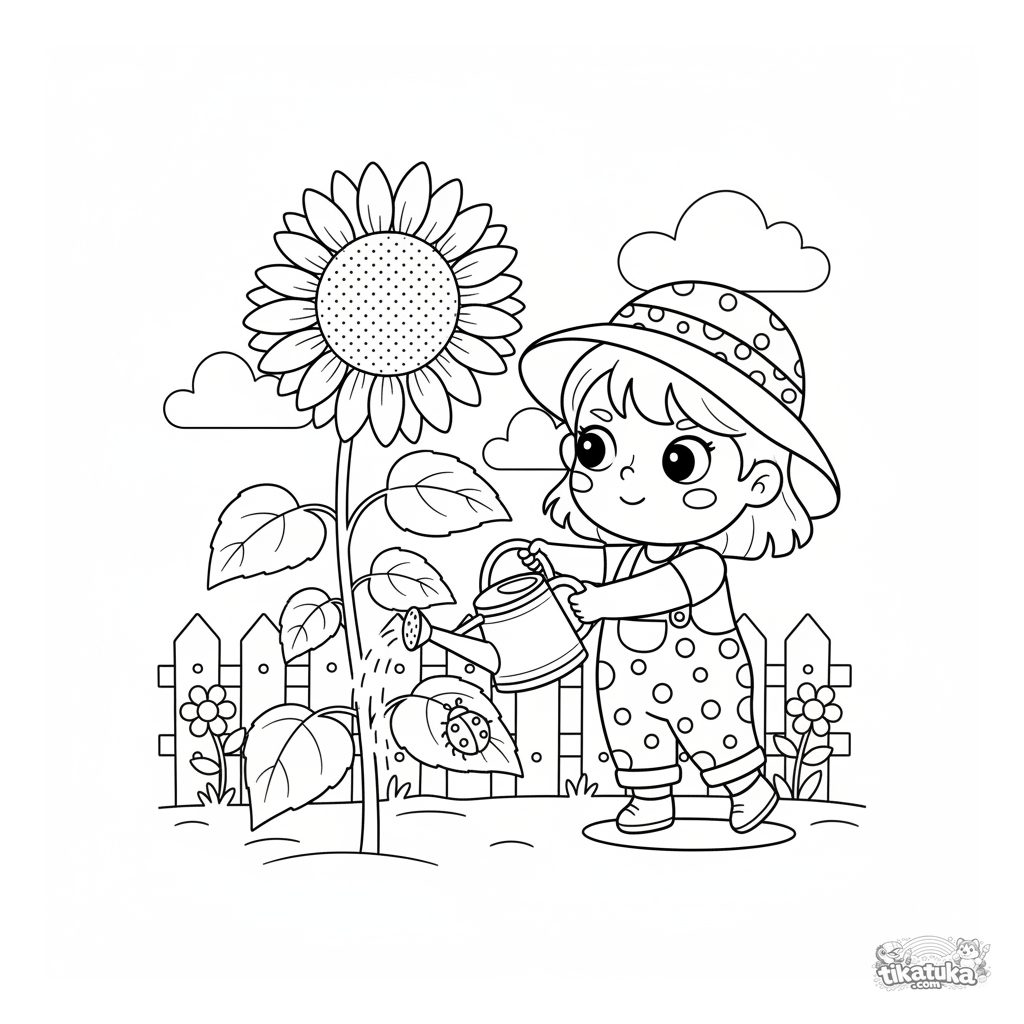 Ausmalbild für Mädchen 4-6: Ein niedliches Mädchen mit Hut gießt eine riesige Sonnenblume mit einer Gießkanne. Einfache, freundliche Szene mit einem Marienkäfer.