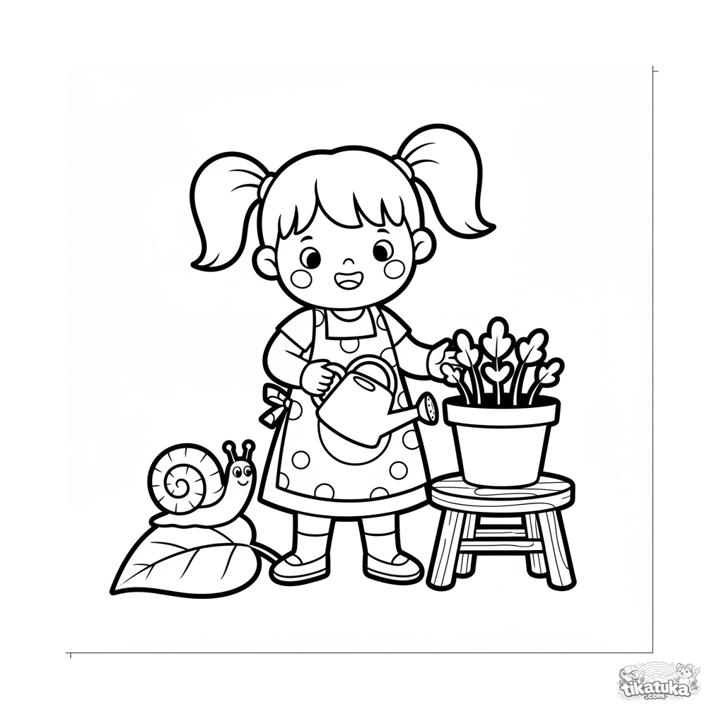 Kleinkind Ausmalbild 2-3 Jahre: Ein Mädchen gießt eine Pflanze im Garten. Sehr einfache, große Formen mit dicken Umrissen.