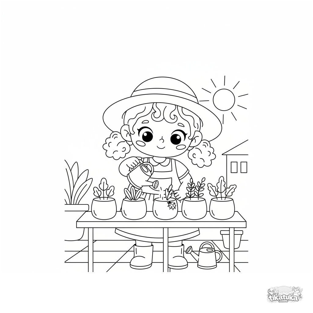 Einfaches Ausmalbild für Kleinkinder 2-3: Ein Mädchen gießt Blumen auf einem Balkon. Große Formen, minimale Details.