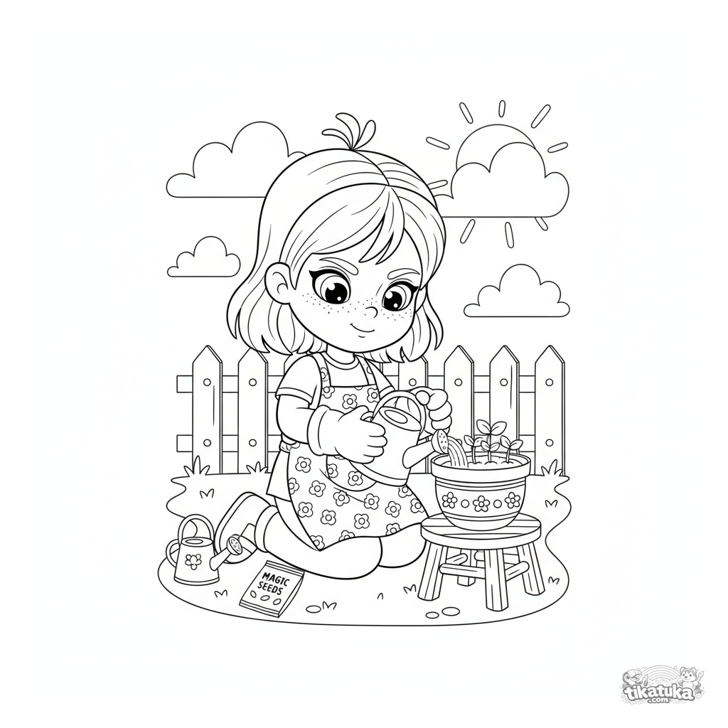 Ausmalbild für Mädchen 4-6: Eine kleine Gärtnerin in einer Schürze gießt die ersten Sprossen in einem Topf. Süße und einfache Szene.