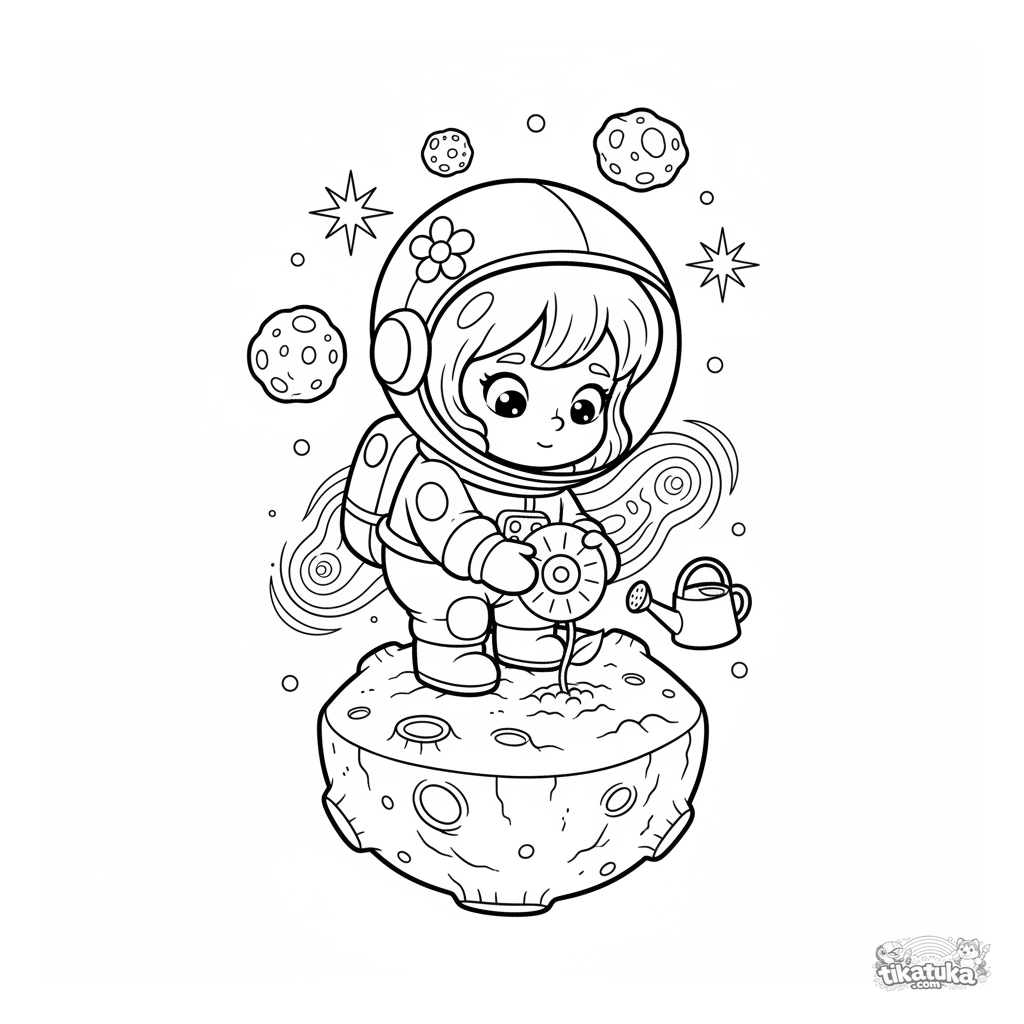 Ausmalbild für Mädchen 4-6: Ein kleines Mädchen als Astronautin mit einer Blume auf dem Helm pflanzt eine kosmische Blume auf einem Asteroiden.