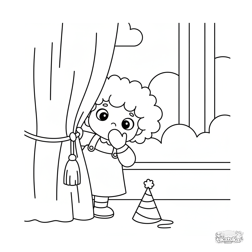 Ausmalbild für Kleinkinder 2-3: Ein kleines Mädchen mit lockigem Haar lugt schüchtern hinter einem festlichen Vorhang hervor. Große einfache Formen, breite Ränder.