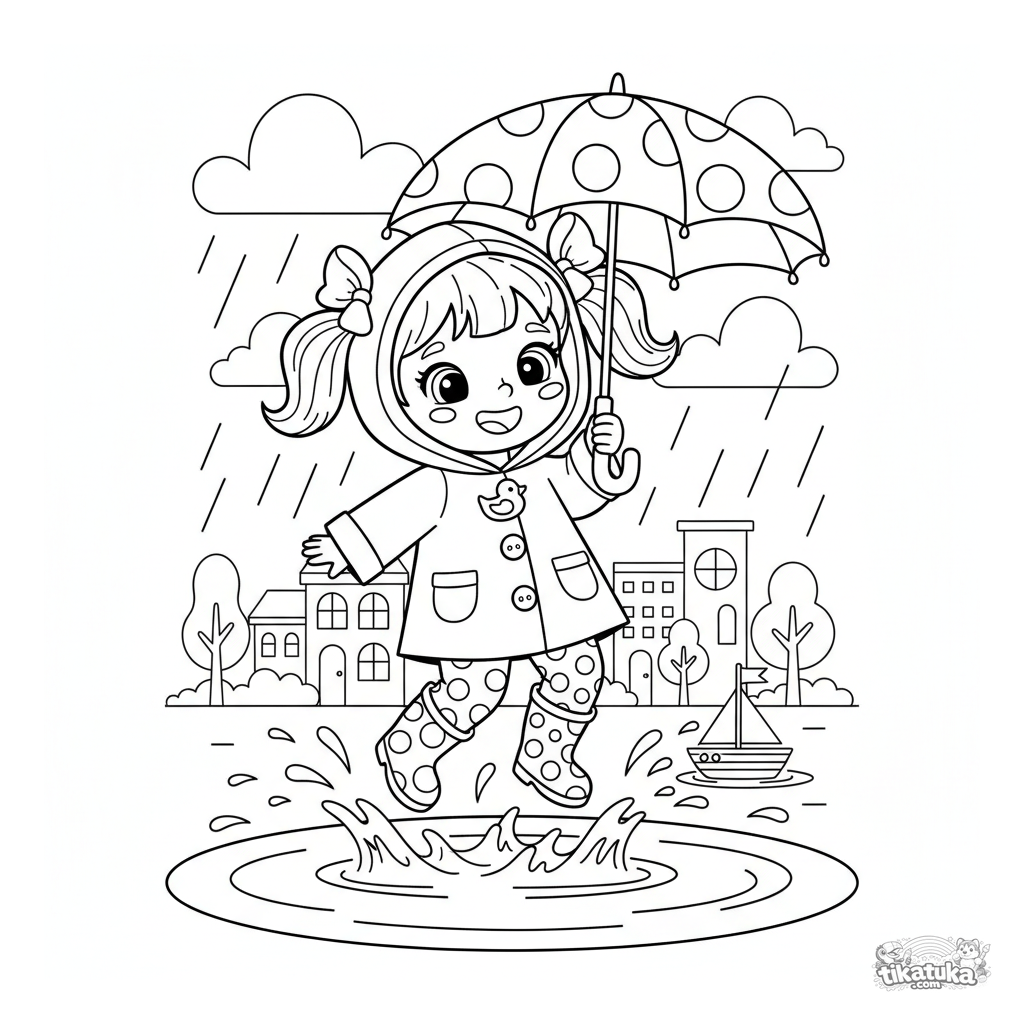 Lustiges Ausmalbild für Mädchen von 4-6 Jahren: Ein kleines Mädchen in einem Regenmantel springt in einer Regenpfütze. Eine helle, einfache Szene fördert Vorstellungskraft und Kreativität.