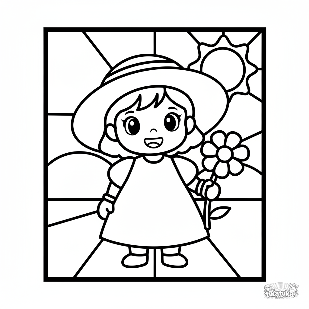 Ausmalbild für Mädchen 2-3 Jahre: ein süßes Mädchen mit einem großen Hut und einer Blume. Große Details, einfache Umrisse. Malen-nach-Zahlen-Ausmalbild für Kinder.