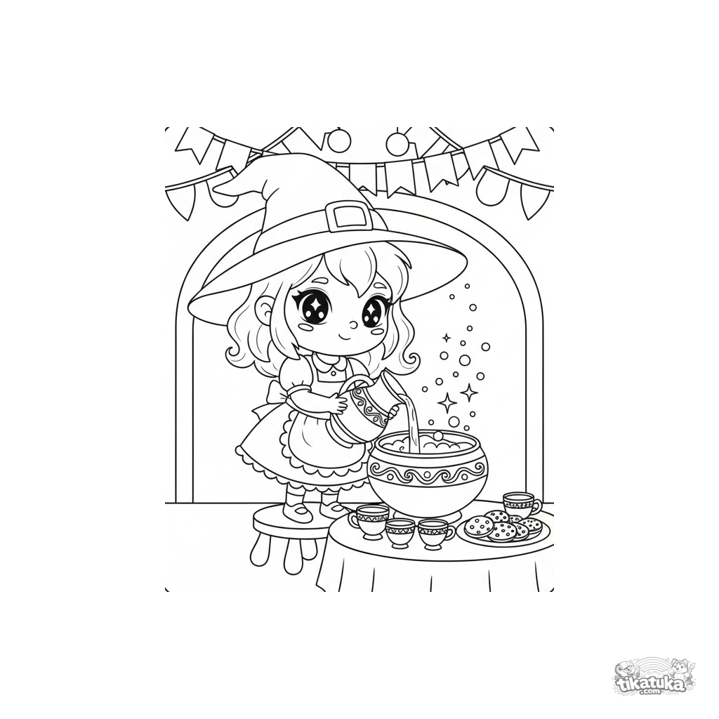 Ausmalbild für Kinder von 4-6 Jahren: Eine niedliche kleine Hexe bereitet magischen Punsch für eine Party zu. Freundlicher Fantasiecharakter.