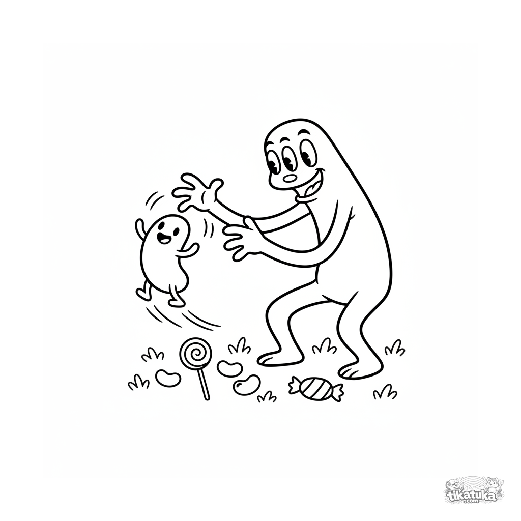 Ausmalbild für Kinder 4-6 Jahre: Ein Langarm-Monster im Retro-Stil spielt Fangen mit einer springenden Süßigkeit auf einem Picknick. Dynamische und lustige Szene.