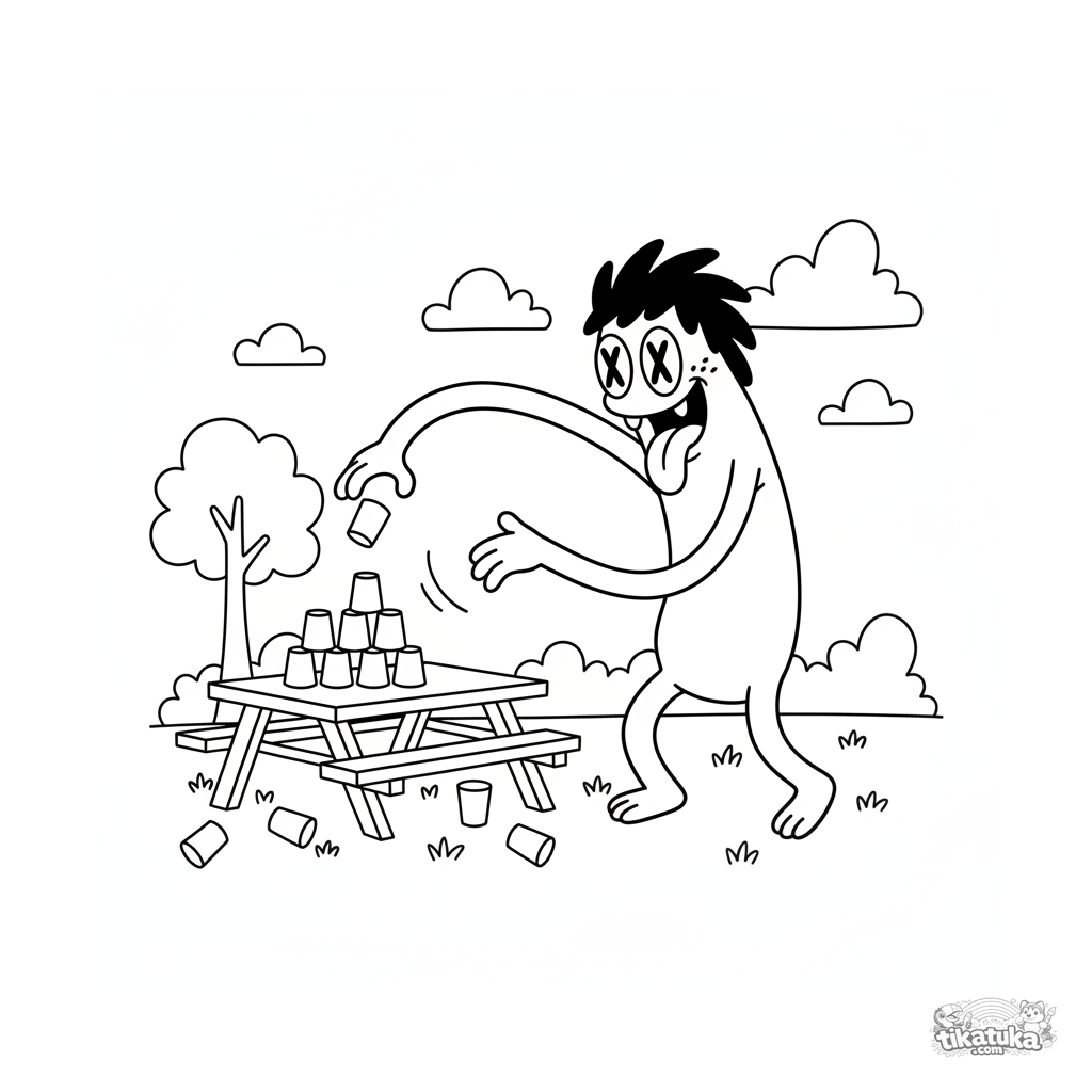 Ausmalbild für Kinder 7-9: Ein Langarm-Monster in dynamischer Pose spielt Becherwerfen auf einem Picknick. Ausdrucksstarke Linien.