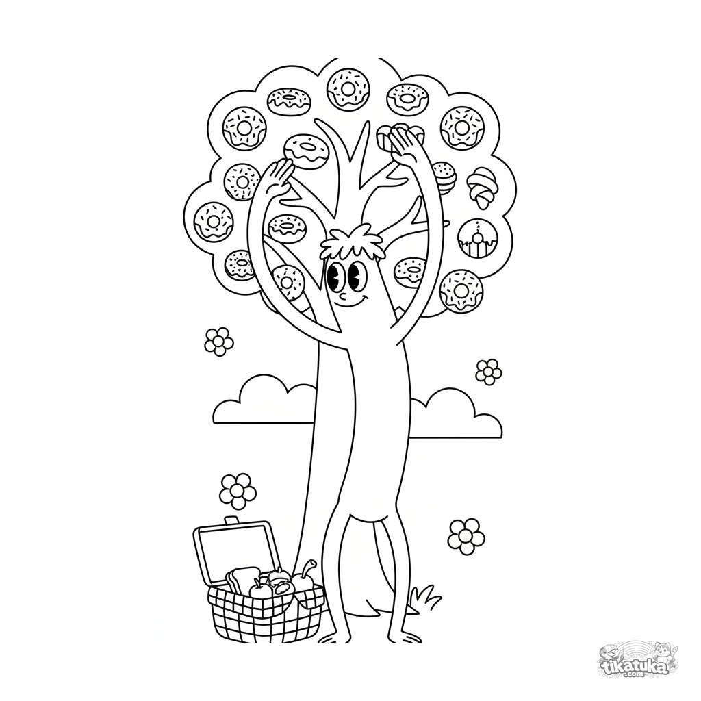 Ausmalbild für Kinder 7-9: Ein Langarm-Monster im Retro-Stil greift nach einem magischen Donut-Baum auf einem Picknick. Dynamische, fantastische Szene.