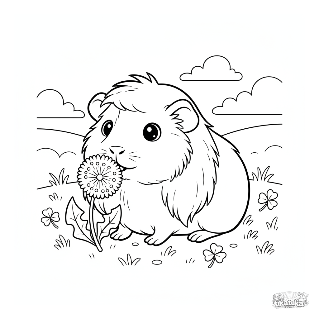 Ausmalbild für Kinder 4-6: ein flauschiges, langhaariges Meerschweinchen auf einer Wiese mit einem Löwenzahn. Eine süße, einfache Szene zum Ausmalen.